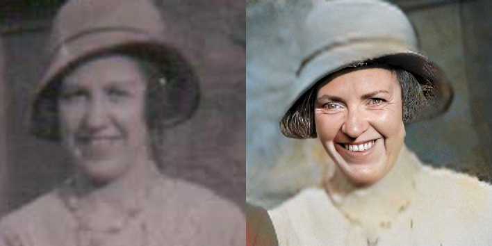 On the left, a scan of a photograph of my paternal grandmother, which I helpfully uploaded to Ancestry.com a few years ago,