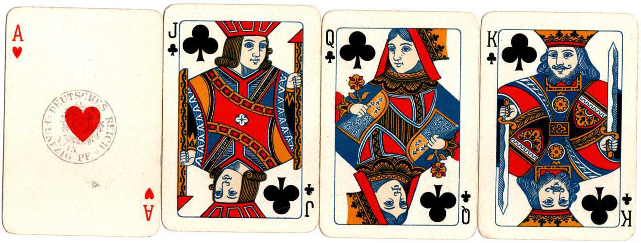 I doubled the size of the cards in the scan (they're patience cards) so you could read the Jack's chest band, but doing so also made the tax stamp on the Ace of Hearts easier to read. It's from district 15, which is the one for Frankfurt am Main. This particular stamp was used in Germany from 1889 to 1918. The #243 packs were manufactured from 1909 to 1933, so that dates mine to somewhere between 1909 and 1918 inclusive.