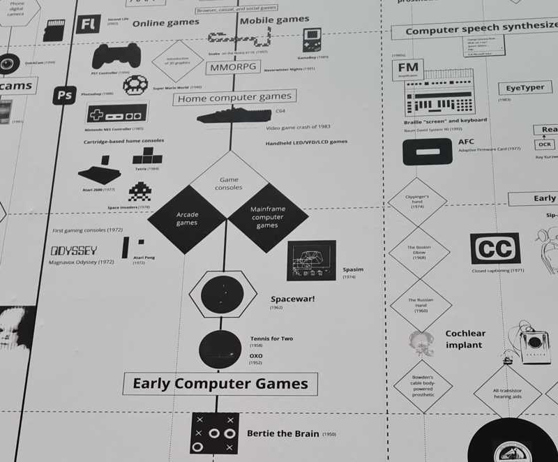 In the modern art museum at the Laboral complex in Gijón, Spain, there's a wall showing the development of different arts, sciences and technologies (or at least there was when I visited it last year). Pleasingly, it includes a strip for computer games.