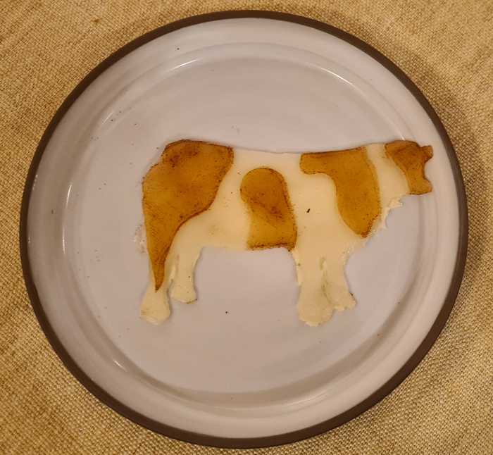 It's a gominola de miel, or honey gummy. Quite why it looks like a cow I've no idea, it didn't taste like cow. Perhaps it was to get people thinking, ending a meal with a conversation-starter.