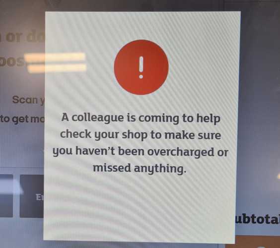 How is this "colleague" (who's no colleague of mine) able to check whether I've been overcharged? What they do is rootle around in my bags, scanning random items. They can't detect whether I've been overcharged or not: their scanner uses the same pricing system as the customers' scanners. They could perhaps check that I'd not scanned the same item twice, but they'd have to rescan everything in my bags to do that, not just a random sample.