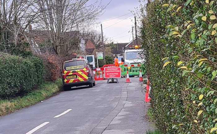 The sign reaads: "TEMPORARY OBSTRUCTION 15 MINUTES DELAY".