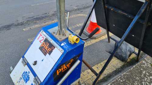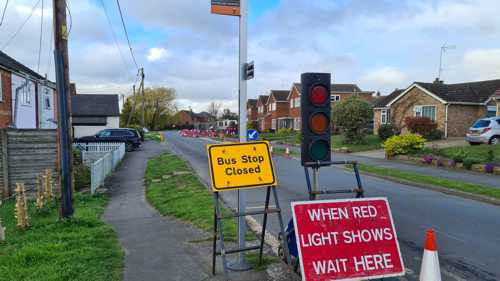 The footpath was diverted onto the road, with barriers surrounding it. This narrowed the road, so the workers installed the traffic lights. Traffic is so light, though, that most of the time we were left waiting for the light to change but nothing was coming in the opposite direction.