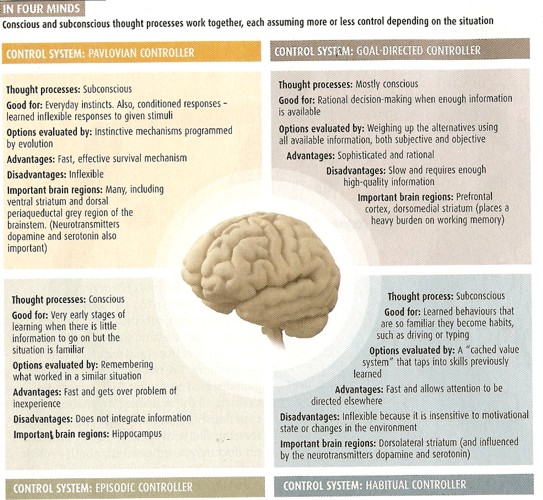 Reading the article, some of the analogies are quite striking (they talk about the habitual controller in terms of social activity, for example). They also use implicit/explicit as a dimension, which is what I added to transform my 4-type model into an 8-type model (implicit means subconscious, explicit means conscious). The other two dimensions I use are not particularly relevant to this classification, but nevertheless it's interesting to note that there's still a very good correlation between the different behaviours of the mind and my 4-type model. I don't know why they match up so well, of course, but it does seem to be somehow supportive of my model rather than denying of it.