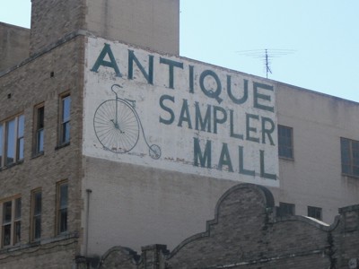 I love the way that in the centre of major American cities you get weird and wonderful one-off shops that it's amazing ever get enough customers to survive. The land they stand on ought to be worth more than the business. This is an arcade of shops selling antiques (for definitions of "antique" that stretch into the 1970s). Presumably, the word "sampler" is there to entice newbie collectors to enter their doors...