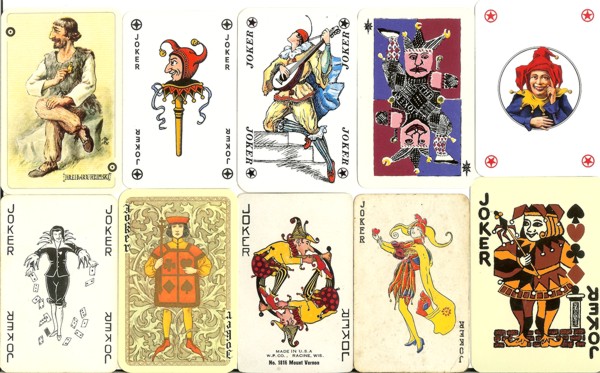 The card in the top right is a design used by Modiano, an Italian company. I'm sure one of my packs has the middle-top one as its joker, but I couldn't find it when I looked through them just now. The bottom-left one would be good if it were in colour and didn't depict cards on the card itself. The second-left on the top line is one I've seen before but I don't have. The middle-bottom card is by Western Publishing (it says on it, "W.P. Co.,Racine, Wis."). I don't know anything about the rest.