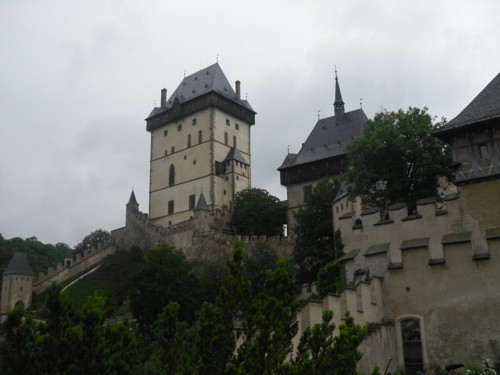 This morning, we went on a tour to Karlstein Castle, an imposing structure built to house the crown jewels of the former Kingdom of Bohemia. I think the main system of defence was the fact they built it at the end of miles of back roads so you'd need a map ever to find the place, and when the crown jewels were once put in actual danger they were moved to Nuremburg for safe keeping. Still, it's quite imposing: