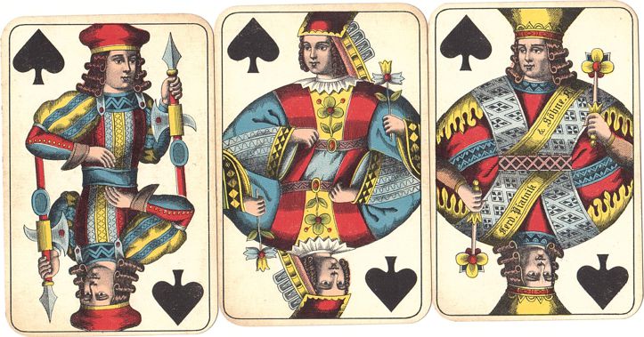 These cards are designed according to the Vienna pattern, which comes in two versions. This particular one is called "large crown" because the kings all have bucket-sized headwear.