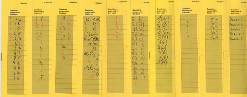 Not present are examples of ones which list the questions in the order attempted rather than in numerical order. Also omitted are the ones that miss questions out. I decided not to include them so that if past or present students recognised their handiwork they didn't gain an impression that I was laughing at them (I'm not) or that writing it "wrongly" cost them marks (it didn't).