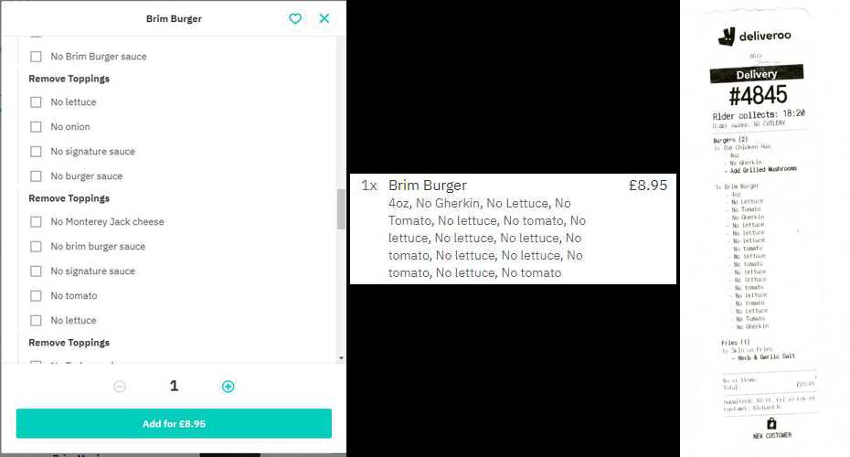 On the left, the multiple boxes from the Deliveroo web site. In the middle, the order summary on the web site. On the right, the printed receipt that came with the order.