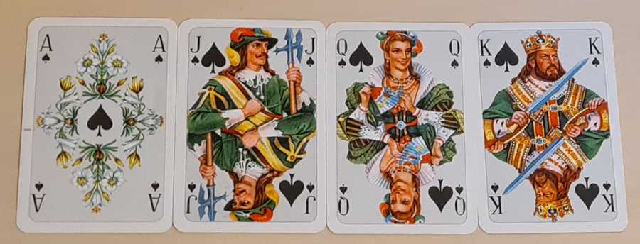 The faces, particularly on the queens, looked as if they'd been modelled on real people, so I was a little concerned that I'd bought a deck based on well-known East German actors or something. That turns out not to be the case, though. It's a Coeur Salon-Karte no. 66, made in 1968, presumably for the UK or US market.